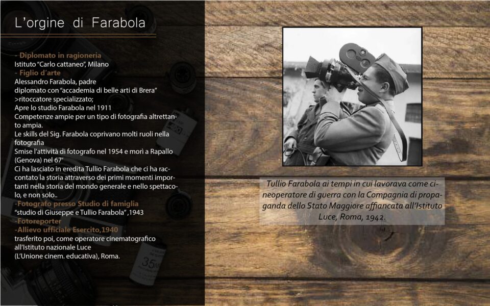 Progetto: il fotogiornalista ha una vita interessante sotto il punto di vista storico, partendo dall’aiutante del padre per foto di studio, fotografo-militare che ha studiato cinematografia ad riavviare lo studio Farabola & co. dopo l’esplosione e la perdita di molti rullini.